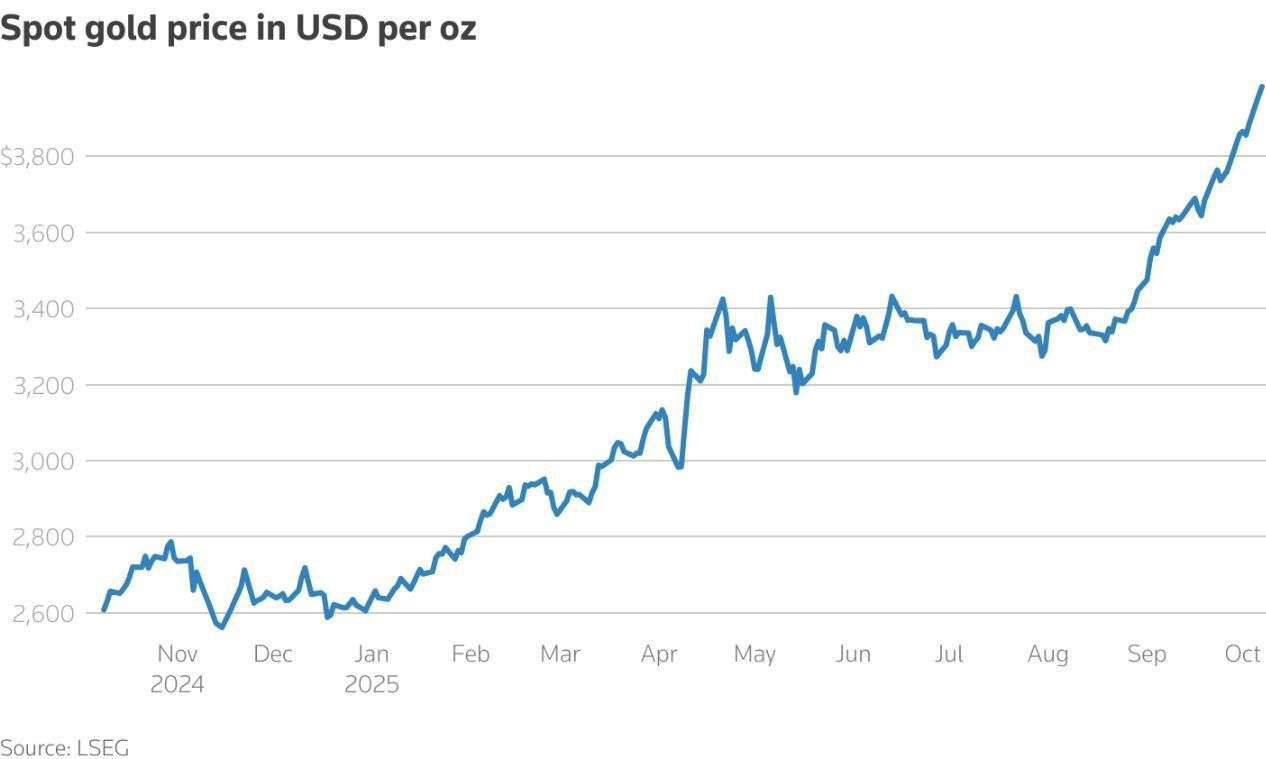 امروز چهارشنبه قیمت هر اونس طلا با عبور از مرز ۴۰۰۰ دلار، به رکورد جدیدی دست یافت. بالارفتن تمایل به سرمایهگذاری امن در مواجهه با ناثباتیهای اقتصادی و ژئوپلیتیکی و همچنین انتظارات برای کاهش بیشتر نرخ بهره توسط فدرال رزرو ایالات متحده علت افزایش امروز قیمتها بوده است.